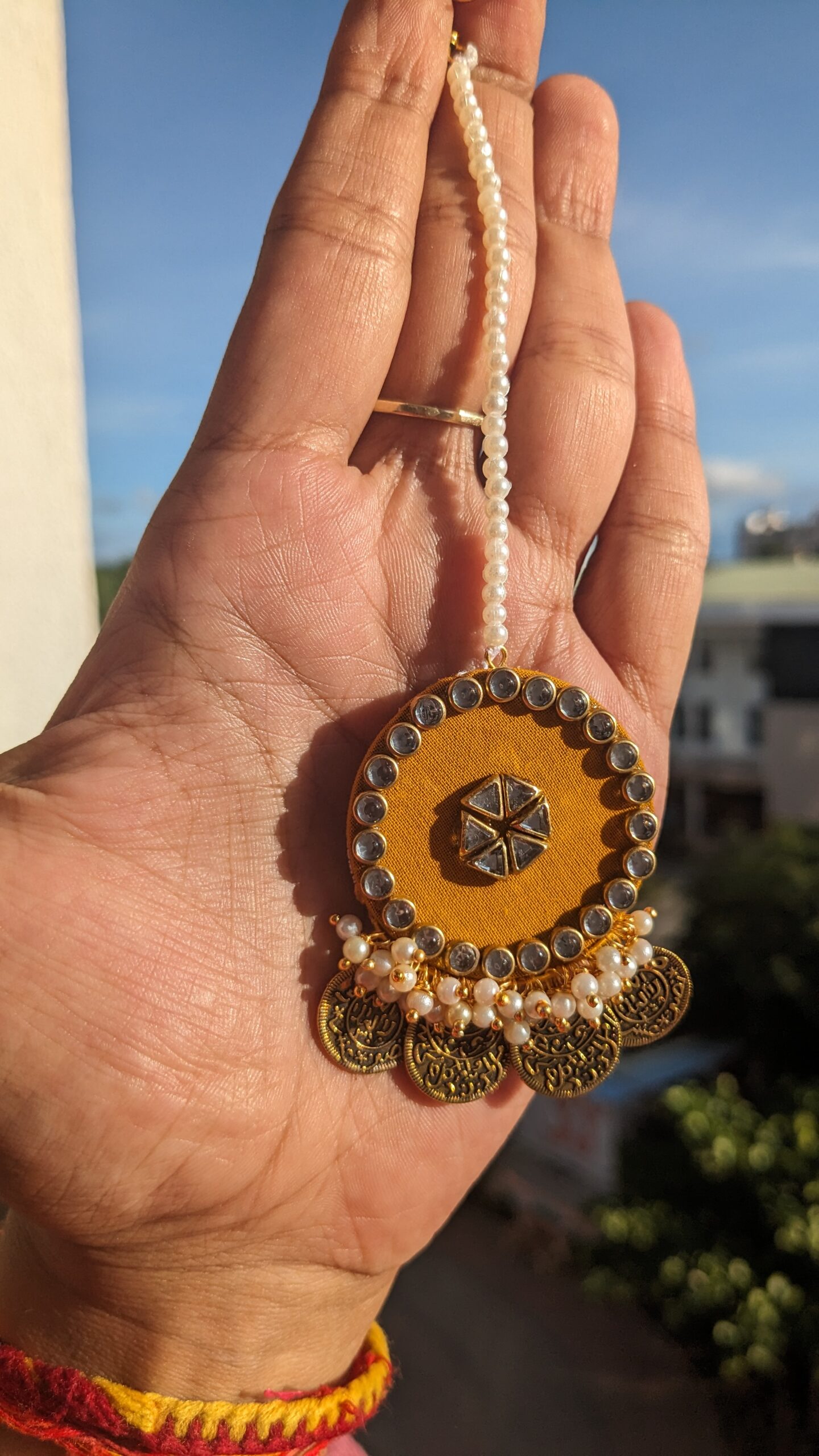 Elevate your navratri look with the special mustard fabric mangtikka, thoughtfully crafted to add a touch of tradition and elegance to your festive attire. This exquisite headpiece is a stunning blend of timeless design and modern flair, perfect for women and girls alike. Handcrafted with care, this Mathapatti showcases the beauty of silver oxidized metal, offering a unique blend of durability and sophistication. The intricate design features delicate Ghungroo embellishments, creating a melodious jingle as you move, enhancing your festive experience. Designed to capture the essence of Navratri, this Mathapatti symbolizes grace, tradition, and festivity. It’s an ideal accessory to complement your chaniya choli or lehenga ensemble, enhancing your overall appearance. Whether you’re participating in the Garba dance or attending Dandiya nights, this headpiece will make you stand out with its captivating charm. The adjustable chain at the back ensures a comfortable and secure fit, allowing you to focus on the celebrations without any worries. The headpiece is lightweight and easy to wear, ensuring you stay comfortable throughout the festivities.