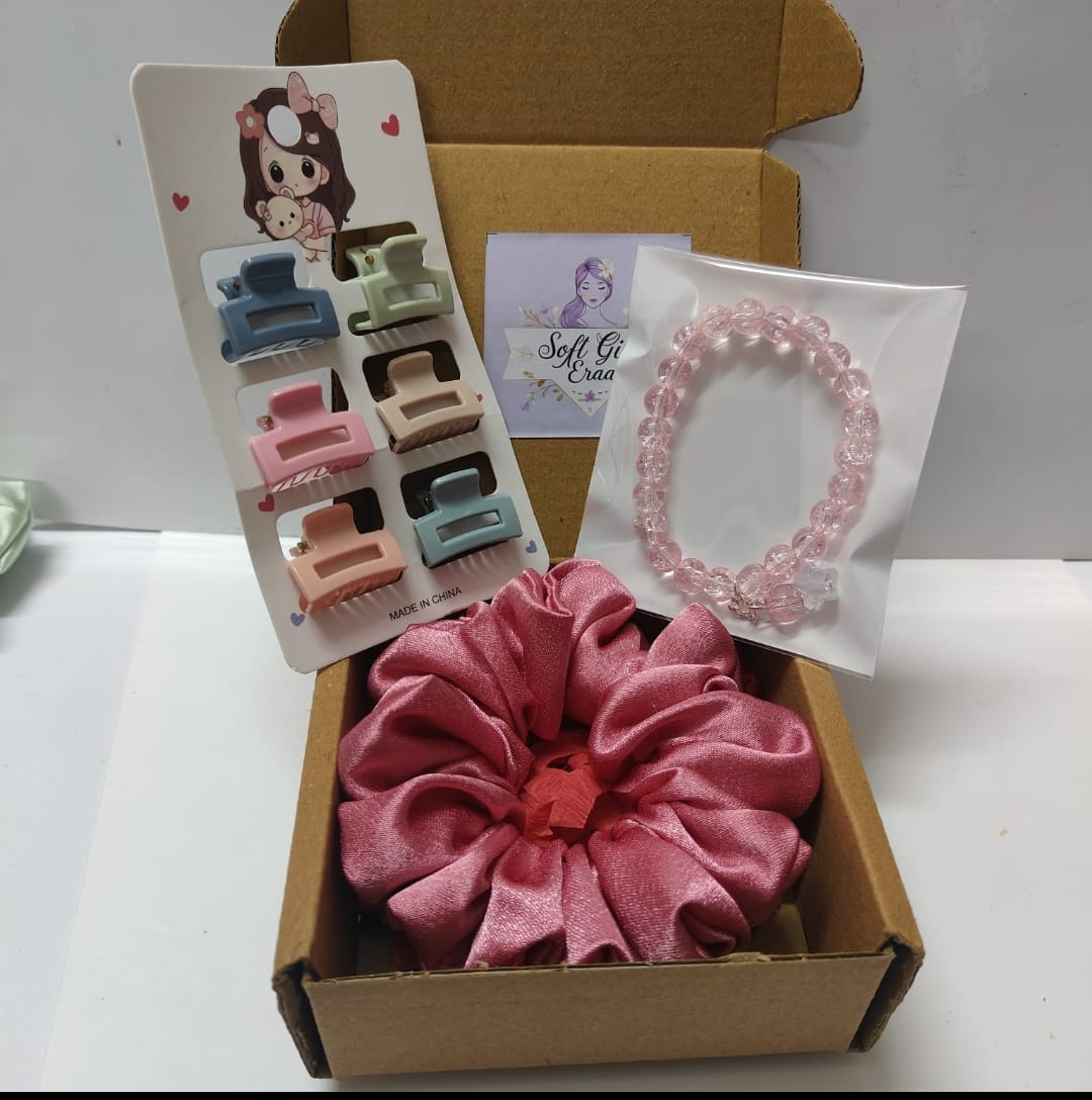 - This order has a Unique Mini gift hamper for girls and women. It consist of Scrunchie, Bracelet and One Clutcher set