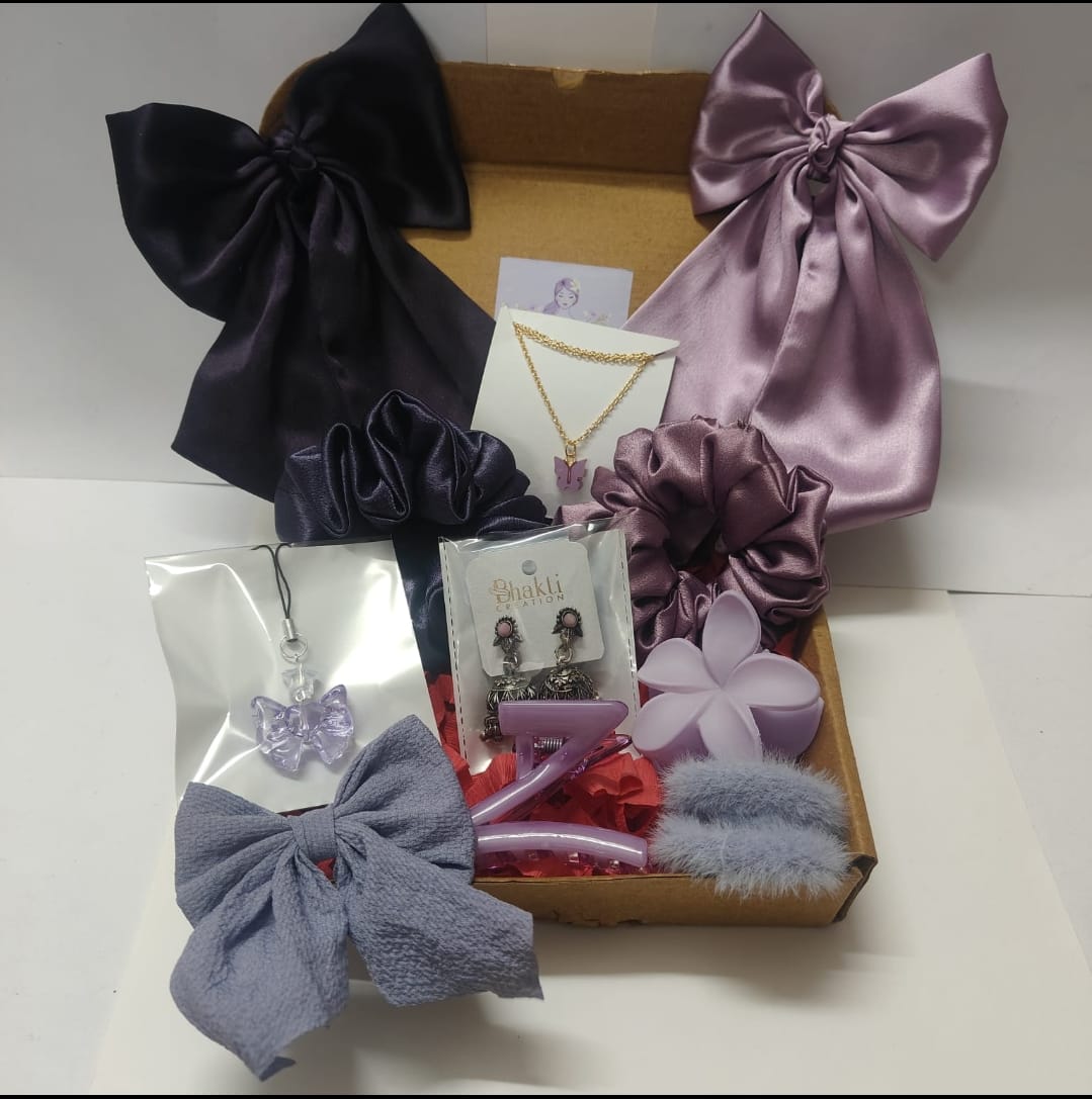 - Complete Purple Gift Set for Her – Includes 12 handpicked items: 2 hair bow clip, 2 fluffy scrunchies , 1 charm necklace, 1 bow phone charm, 1 mini hair bow clip, 1 Jhumka, 1 korean clutcher, 1 flower clutcher , 2 Rubber bands– ready to gift instantly
